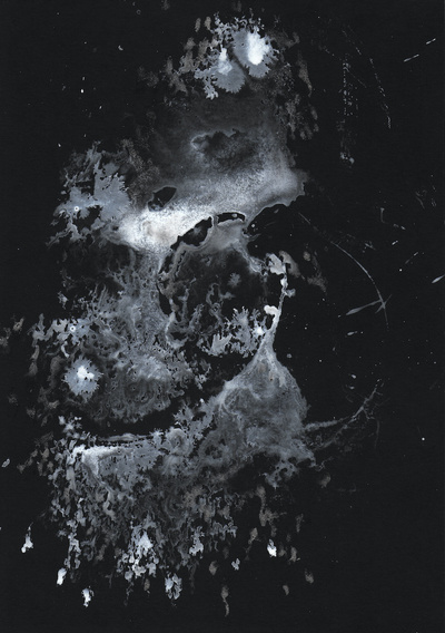 Série en noir et blanc, traces faites avec des cordes de guitare, de l’eau et de l’encre.